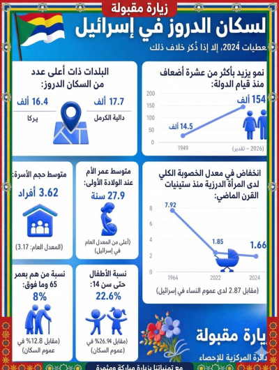 يستدلُّ من المعلوماتِ التي نشرتها دائرةُ الإحصائياتِ المركزيّة عشيةَ زيارةِ ضريحِ نبيِّ اللهِ شُعيبٍ عليهِ السلام، أنَّ نسبةَ الولادةِ لدى الدروزِ ما زالت في تراجعٍ مستمرٍّ وقد وصلت في عام 2024 إلى 1.66 طفلٍ للعائلة، مقارنةً إلى 1.75 في عام 2023، ومقارنةً إلى 1.85 في عام 2022، و 1.94 في عام 2021 (ومقارنةً إلى 7.9 عام 1960 و 4.1 في عام 1990 و 3.1 أولادٍ في عام 2000 و 2.2 عام 2019) وأنَّ نسبةَ الطلابِ الجامعيين قد تعززت وتضاعفت بشكلٍ ملحوظٍ وبالأخصِّ لدى الفتيات، كما سيأتي على ذكرِه لاحقاً.